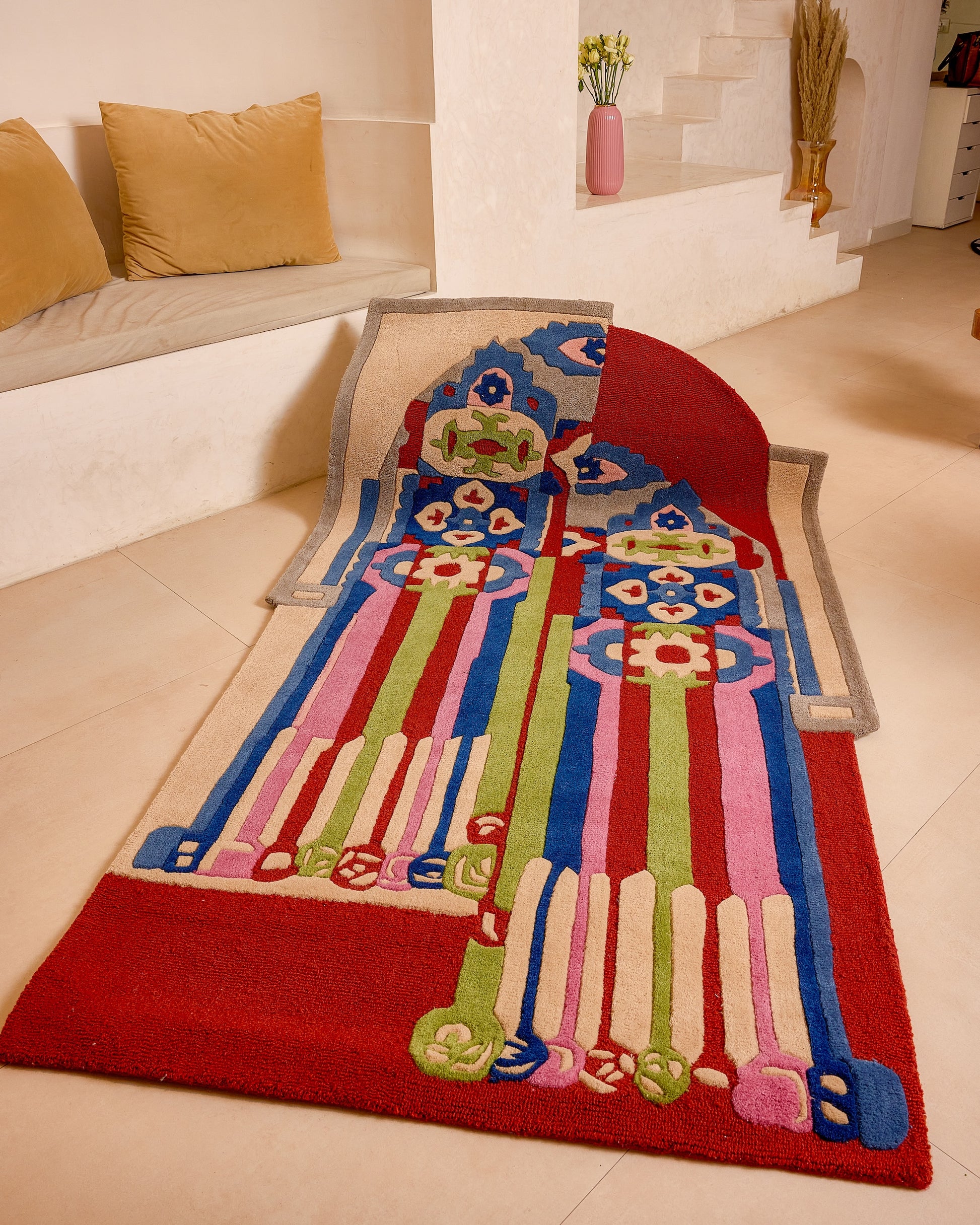 The Metamorph rug is a stunning representation of artistry and tradition, featuring a vibrant multicolored design inspired by traditional Moroccan patterns. As the eye travels across the rug, the intricate motifs gradually transition into straight lines, showcasing wool strands that symbolize the craftsmanship involved in its creation. The design culminates in a beautifully warped ball of wool, emphasizing the evolution of traditional artistry into modern aesthetics. Ideal for adding a unique touch to any space, the Metamorph rug invites warmth and character, making it a perfect statement piece for contemporary interiors.