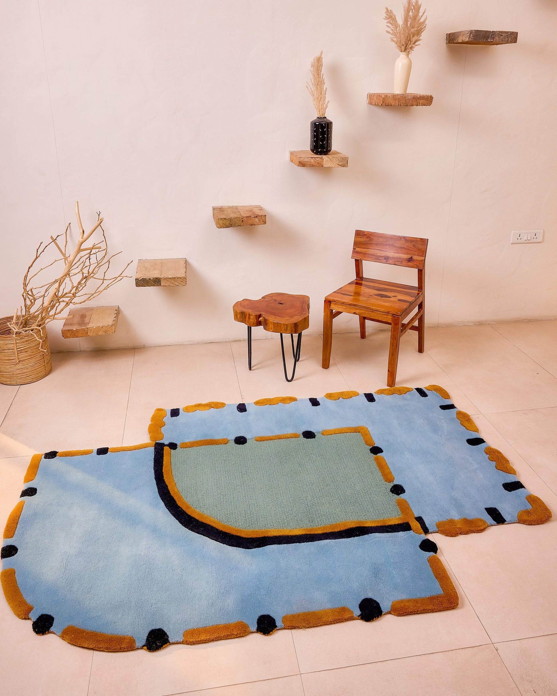 The Nexus rug is a striking fusion of geometric elegance and playful design. Solid blue rectangles overlap in a layered composition, each outlined with a unique dash-and-dot border in vibrant yellow and black.This rug is more than a decor piece—it's a modern statement, bringing both structure and a hint of fun to any space. Perfect for adding personality and visual intrigue, the Nexus rug transforms any room into a focal point.