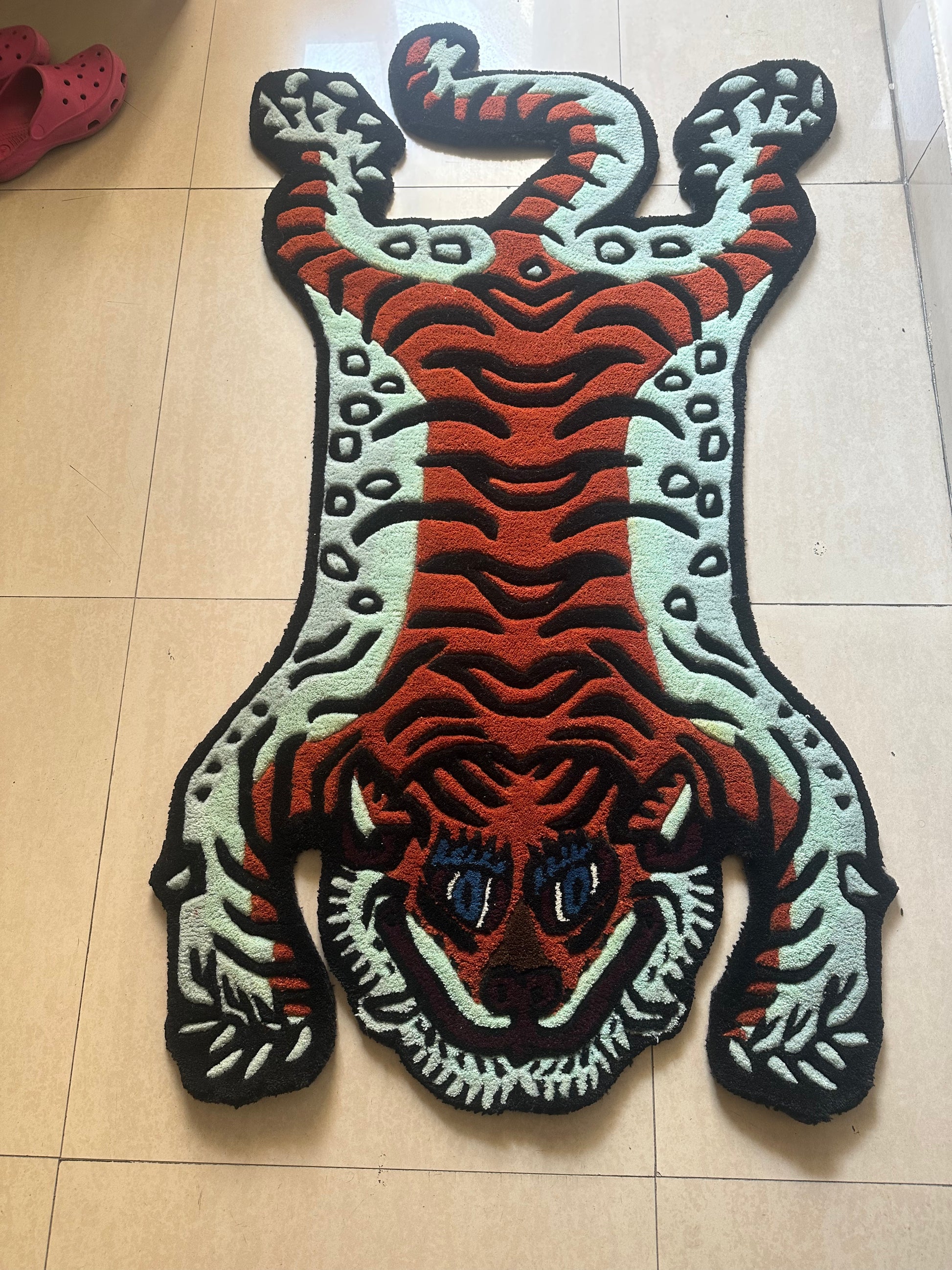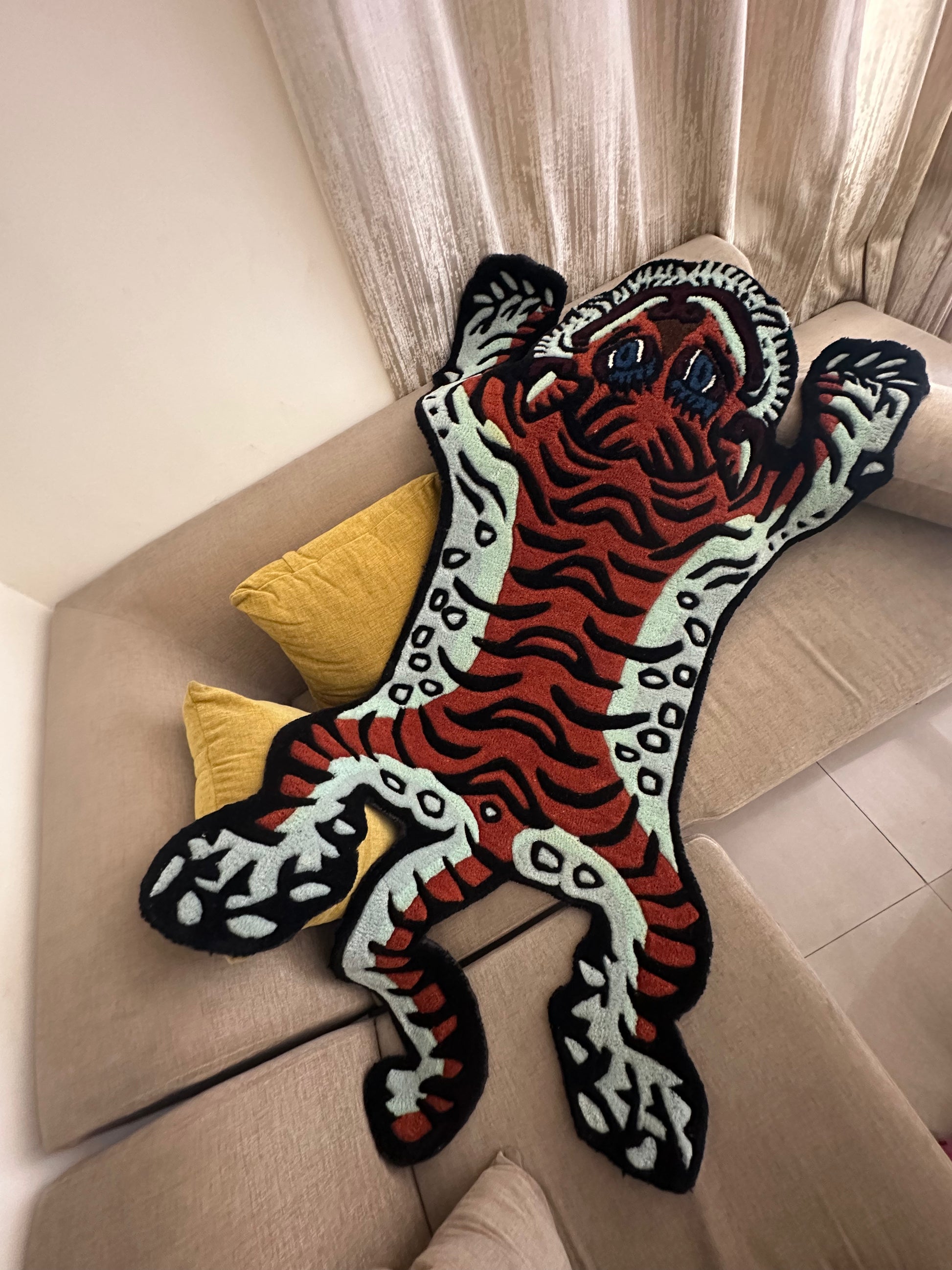 The Tiger rug is a striking, textured piece shaped like a tiger, featuring detailed stripes and a bold design. Perfect for adding a touch of wild elegance and personality to any space.
